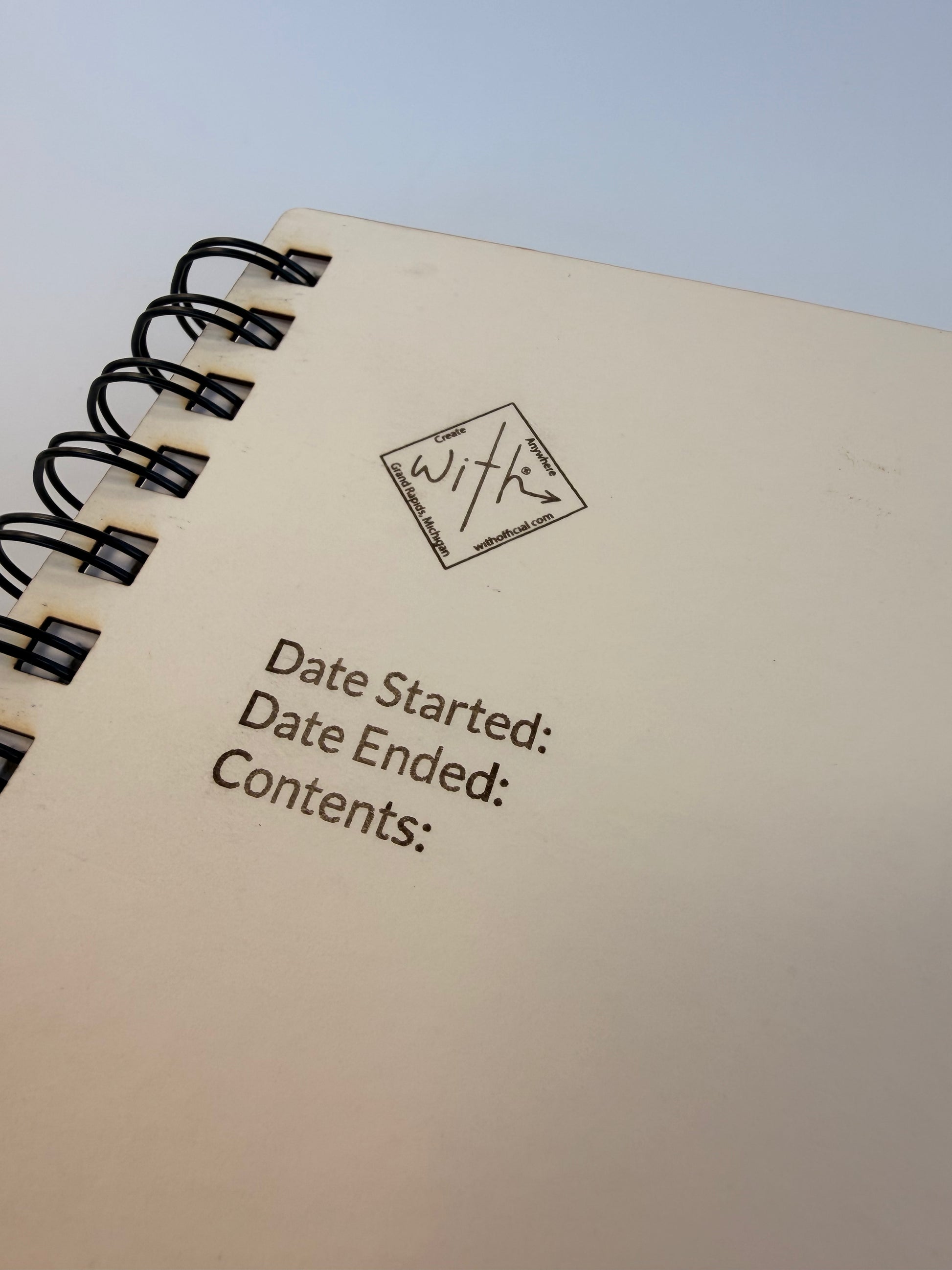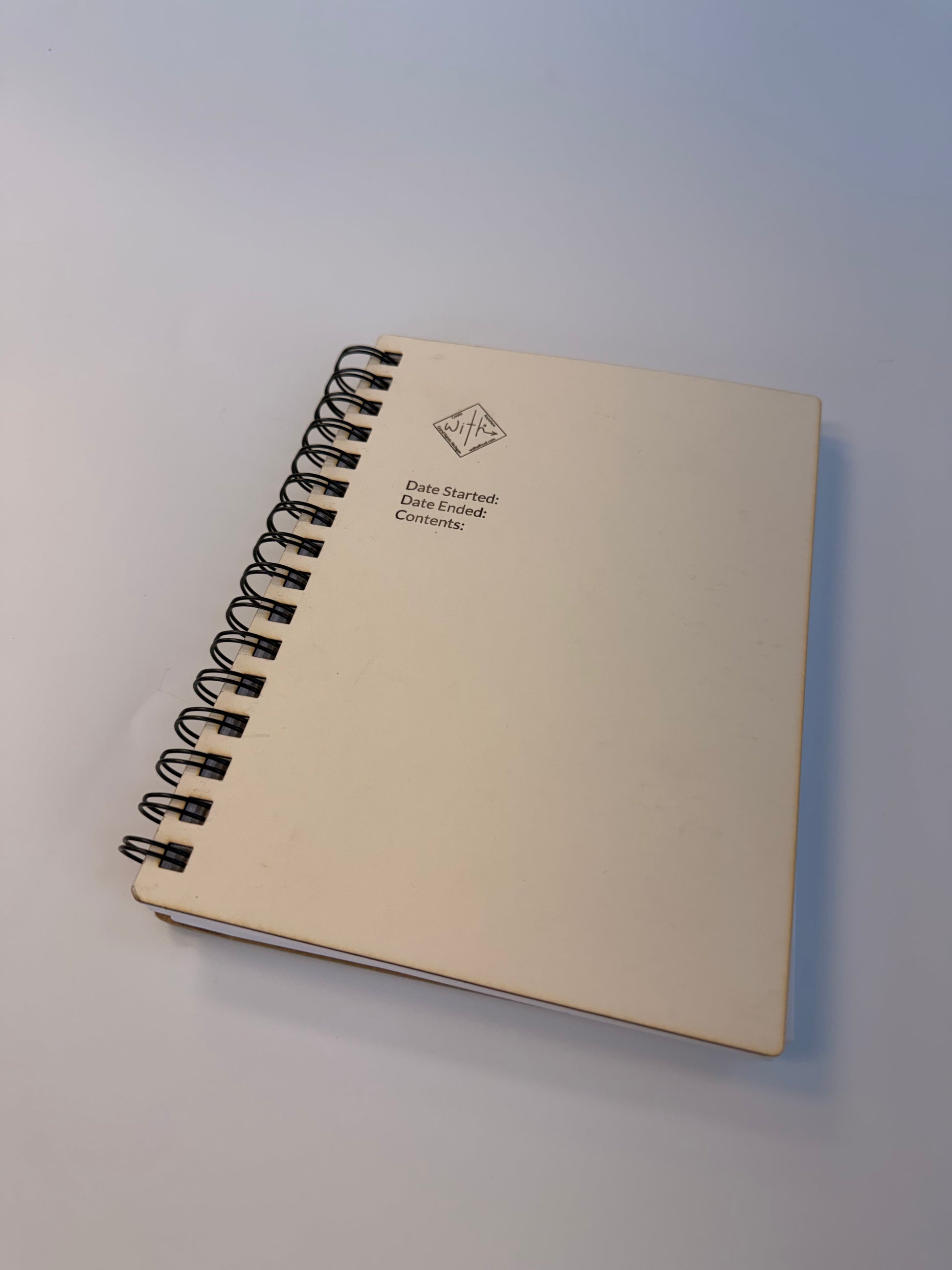 Off white matte board cover with place to write to the contents and personalize.